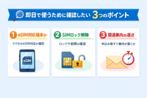 eSIMは便利ですが、何も確認せずに申し込むと「思ったより時間がかかった」「設定できなかった」ということもあります。