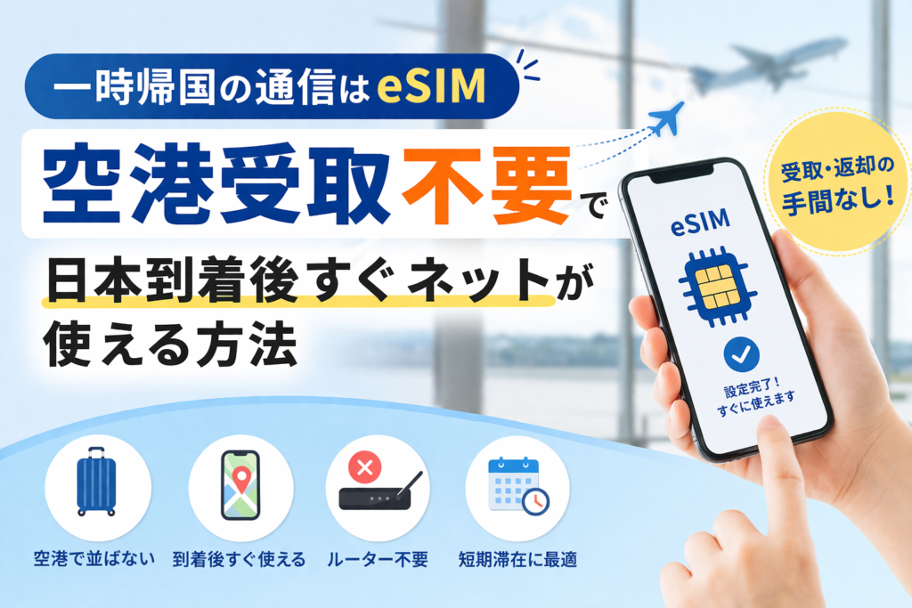 海外から日本へ一時帰国するとき、「スマホの通信をどうするか」で迷う方は多いのではないでしょうか。これまでは空港でWiFiルーターを受け取ったり、SIMカードを購入したりする方法が定番でしたが、最近は空港での受取が不要なeSIMを選ぶ人が増えています。