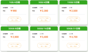 - 滞在期間に応じたさまざまなプランが用意されており、短期から長期まで対応。大容量で高コスパが人気の理由です。